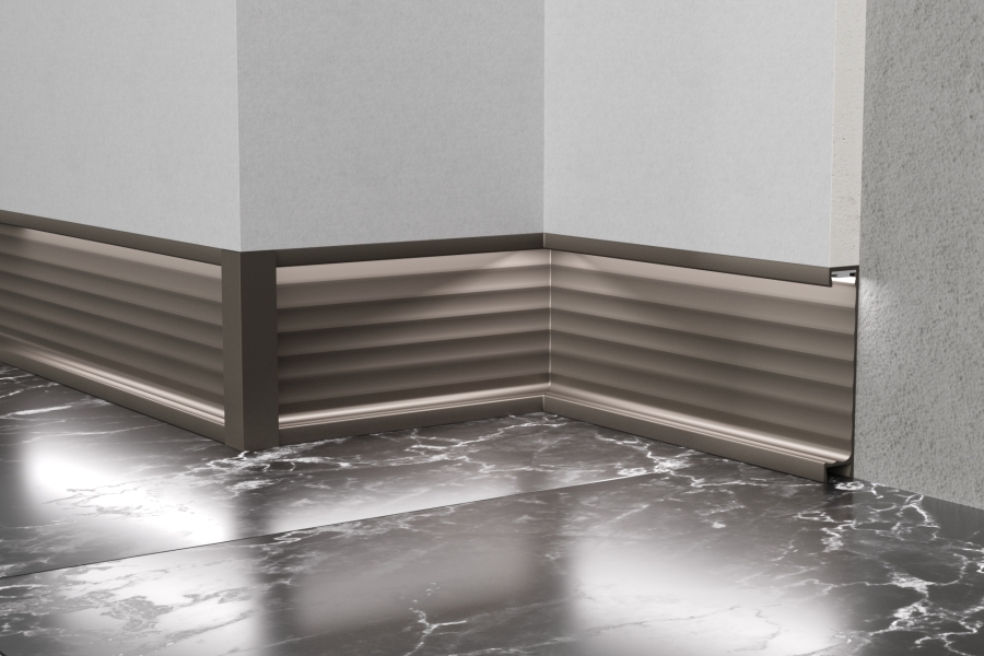 Плинтус встроенный в стену - это стиль современных дизайнеров, который удивит своим изыском любого гостя. С подсветкой алюминиевый плинтус используется не только в квартирах, загородных домах и других жилых помещениях, но и в офисах, бизнес центрах и кинотеатрах. Светодиодная подсветка стен также также используется со встроенным плинтусом в стену, используя его уже как просто профиль для светодиодной ленты. Алюминиевые крепежные клипсы при таком варианте не используются, профиль надежно клеится на жидкие гвозди. Также можно использовать двустороннюю клейкую ленту, рекомендуем использовать производителя 3М. Рассеиватель входит в комплект и бывает матовый или прозрачный. Плинтус изначально анодированный под цвет серебра, но также красится в любой цвет по палитре RAL. Имеется в продаже универсальная фурнитура, которая тоже может краситься в цвет плинтуса при необходимости.